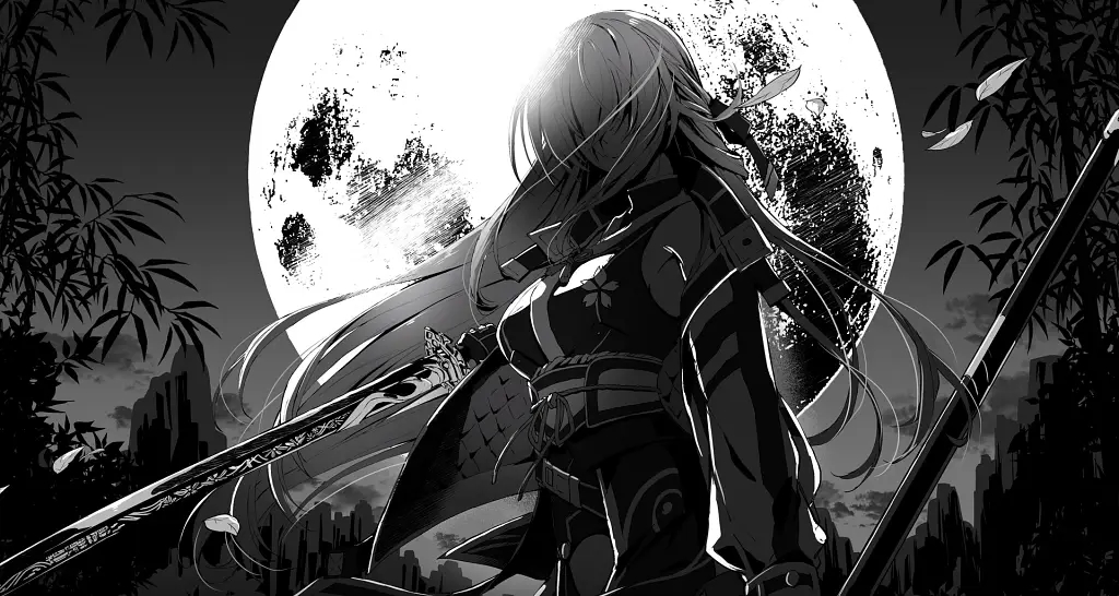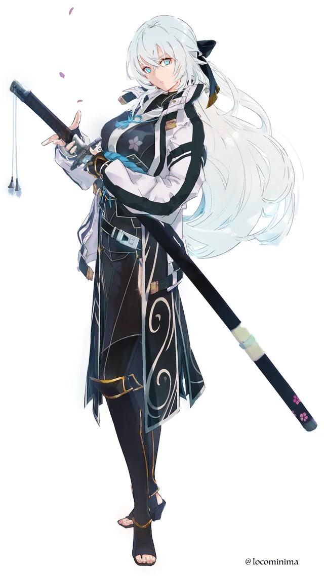 The swirling film of white smoke, that permeates the tree line would break in a sudden dispersal. Sitting with the vague outline as it drifts aimlessly and without purpose. The leaves that find themselves trapped in it turning blueish as they become more rigid, the temperature drop simulating an early winter. The cross wrapped handle of a weapon hung tight to her skin, pressed against her back despite its length. Purple strands ripped across it in a network of overlapping lines, topped with a singular brass cap and a dangling string. The sheathe a cool grey, simple yet functional. Across her b
